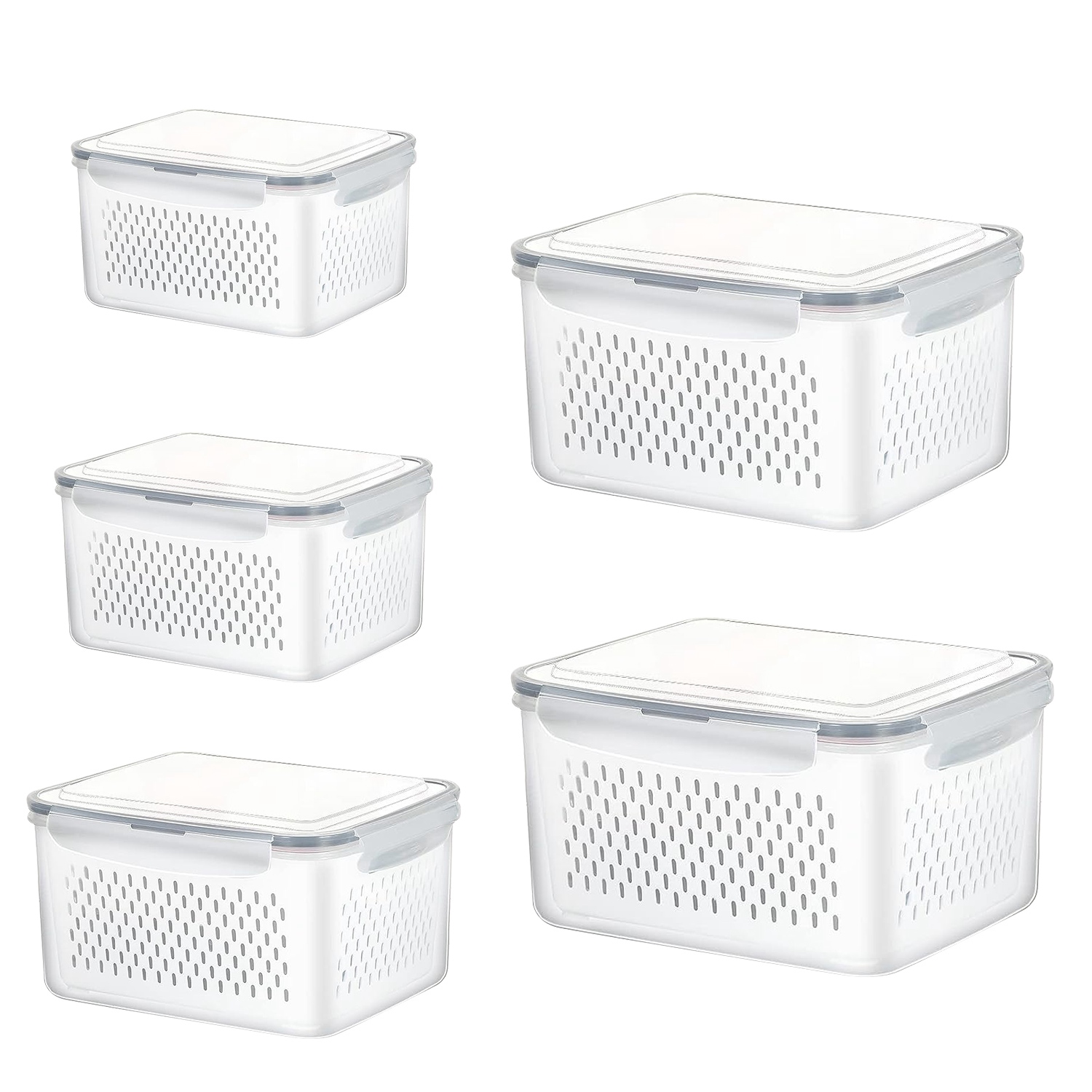 5Pcs Fruit Vegetable Containers with Removable Drain Basket Leakproof Lid Stackable Food Storage Organizer for Fridge Dishwasher Safe